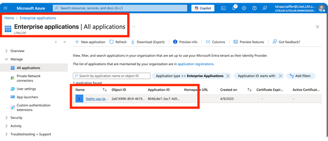 On your Azure Portal, navigate to Enterprise Applications > Select your litellm app
