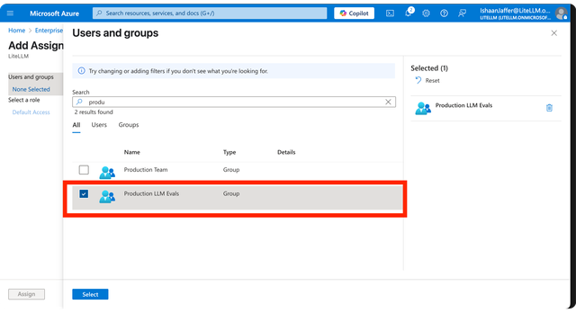 Now select the group you created in step 1.1. And add it to the LiteLLM Enterprise App. At this point we have added Production LLM Evals Group to the LiteLLM Enterprise App. The next steps is having LiteLLM automatically create the Production LLM Evals Group on the LiteLLM DB when a new user signs in.